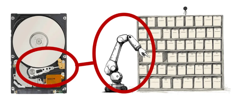 1)机械硬盘存储和提取货物靠的是“机械臂”。