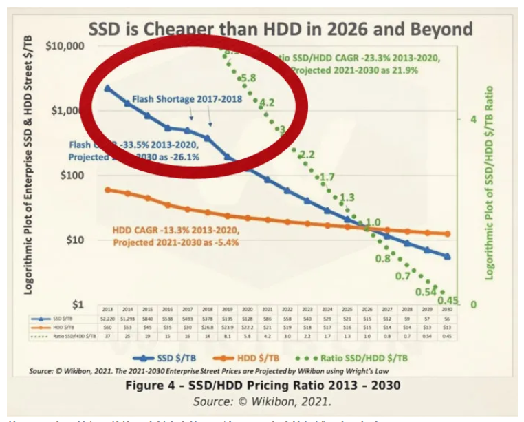 从 2018 年开始闪存价格下降斜率变快,预计 2026 年会比机械硬盘更便宜。