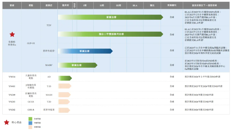 银诺医药专注于糖尿病及代谢性疾病创新疗法,是亚洲第一家及全球第三家商业化原研人源长效胰高血糖素样肽-1 (GLP-1)受体激动剂的公司。下图为公司的产品管线。