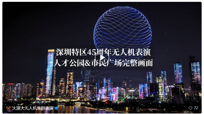 (<大漠大无人机集群表演>视频号:8月26日晚上8时26分,深圳经济特区建立45周年无人机表演。大漠大(DAMODA)1.2万架无人机在深圳市民广场、人才公园双矩阵同时升空。30分钟超长演绎,将科技实力与多位艺术家的创意巧思完美交融,为市民与游客献上一场震撼人心的视觉盛宴。)