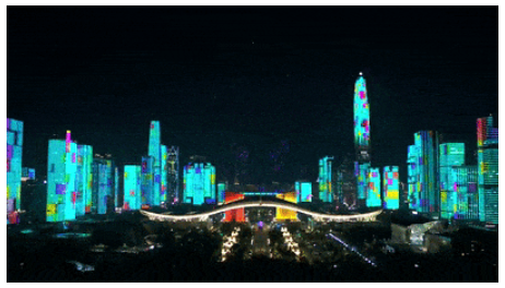 灯光秀团队通过提炼与再创作视觉符号,再根据不同大厦楼宇表面的差异制定专属方案。福田灯光秀运营设计方、深圳永恒光智慧科技集团有限公司福田光环境项目总监袁刚介绍,市民中心建筑结构独特复杂,因此团队前期通过多通道投影融合技术,将41栋大楼画面无缝拼接成一个完整的、符合建筑结构的整体画面,确保视觉效果的完美。