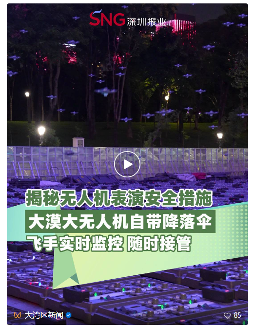 (<大湾区新闻>视频号:揭秘无人机表演安全措施 大漠大无人机自带降落伞 飞手实时监控 随时接管)