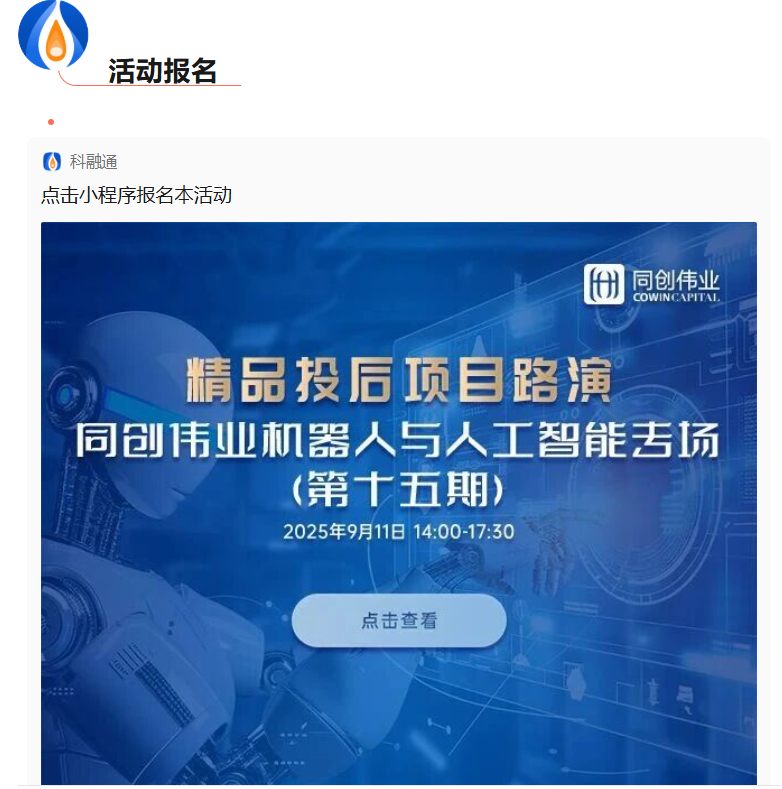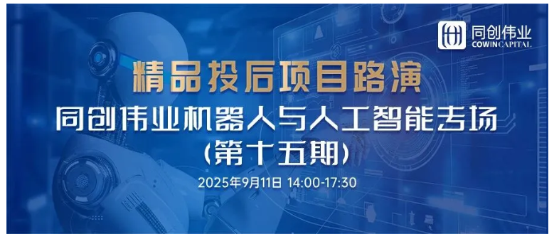 9月11日,同创伟业将联合深交所科融通V-Next共同推出精品投后项目路演——同创伟业机器人与人工智能专场(第十五期)。