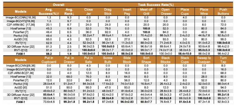 真机部署效果: 少样本下基础任务成功率 97%,挑战任务领先对比模型 30%+ 中科第五纪还将 FAM-1 在真机上与 RVT-2(英伟达)、PI0(Physical Intelligence)、SpatialVLA(Shanghai AI Lab 等)等先进模型进行了全面对比,特别是在少样本情况下的基础任务(Basic)和挑战任务(Distractor、Lighting、Background、Height、Combination、Category)上的对比。FAM-1 在仅使用 3-5 条样本每个 Basic 任务的情况下,可以达到 97% 成功率,远超其它对比模型。 这些结果充分验证了中科第五纪在少样本实体部署方面的优势,尤其能够在不同干扰物体、不同光照条件、不同背景绝大多数复杂因素且极具产业化价值的能力下显著提升模型的泛化性。 总结与展望: 致力于打造工业级通用具身智能体系 FAM-1 是面向机械臂操作的少样本通用基础模型,通过迁移多模态大模型隐含知识和建模三维空间结构信息,让机器人获得了前所未有的跨场景任务的泛化能力和少样本快速学习能力。 基于此,中科第五纪未来将继续深耕以下三大方向: 1、进一步面向操作场景,提升通用基础模型的泛化性、可靠性和适应性; 2、推动基础模型在工业场景下的更多应用; 3、面向导航场景推出通用基础模型。 此外,团队另一项成果 EC-Flow: Enabling Versatile Robotic Manipulation from Action-Unlabeled Videos via Embodiment-Centric Flow 已被 ICCV 2025 接收,展示了从无标注人类操作视频中自监督学习操控策略的新路径,进一步展现了中科第五纪在具身智能核心技术上的系统性创新能力。这意味着未来机器人或可通过观察人类操作视频,自主学习操控策略,进一步降低应用门槛。 从定义具身大模型新标准,到发布国内首个少样本通用具身操作基础模型,中科第五纪的探索正推动具身智能从 “单点技术突破” 走向 “体系化落地”,为机器人真正走进工业生产、日常生活提供了技术支撑。