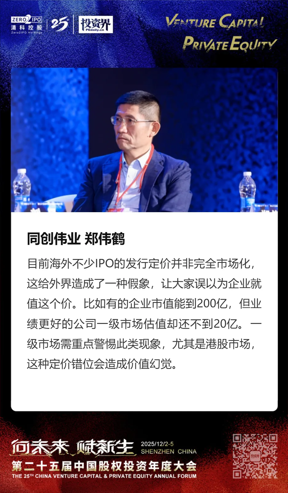 倪正东:回顾2025年,大模型、机器人、创新药都带来很多好消息。下一个问题,目前市场上最大的机会是什么?最大的泡沫又是什么? 郑伟鹤:机会大家都讲了,我想谈一下风险。近期刚上市的一家硅材公司,市值已经冲到了千亿,港股不少新股的估值也在两三百亿,但这里面有很多是亏损企业。由于港股发行制度在基石投资、配售规则等方面有不少调整,导致这些股票的发行和定价没能完全市场化,很容易让我们产生“它就该值这个价”的错觉。 比如有的企业市值能达到200亿元,但业绩更好的公司一级市场估值却还不到20亿元。这种估值严重不匹配的情况,在一级市场必须格外谨慎。当前港股市场里这种现象尤为突出,其实本质上是给行业制造了一种估值幻觉。